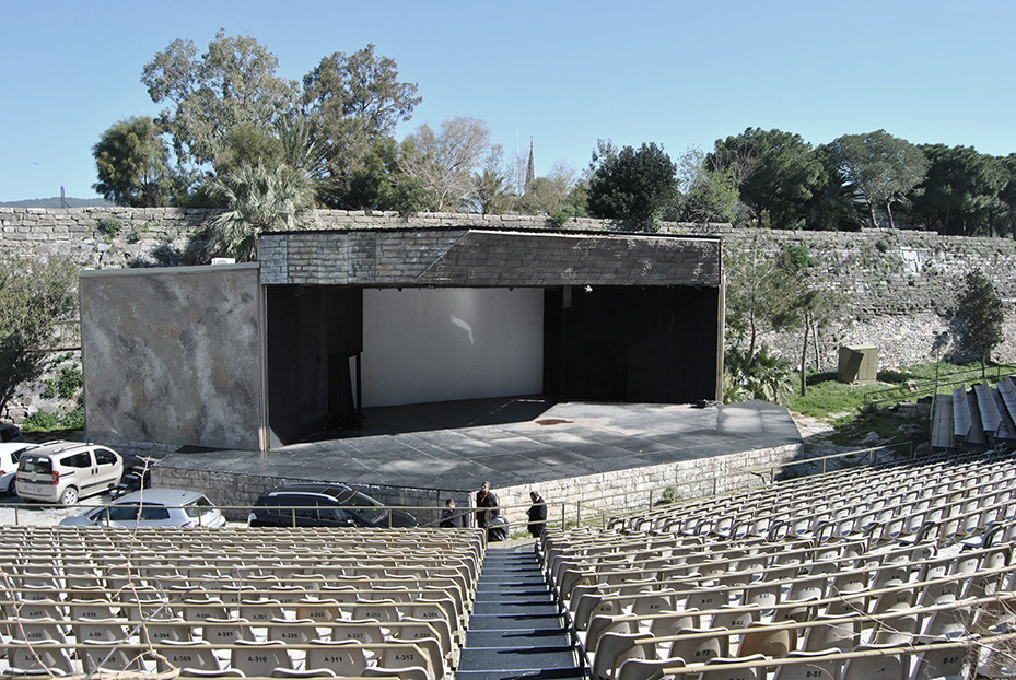 The renovation of an existing open theater situated in Bodrum Castle's north ditch. When first proposal was rejected by Cultural Heritage Committee, a new proposal having similar dimensions with the existing structure is developed with a decreased number of seats. Being situated on an archaeological site, a steel structure with foundations above ground is designed. The facade is cladded with timber slats to emphasize contradiction between permanent & temporary, the historical & the contemporary.