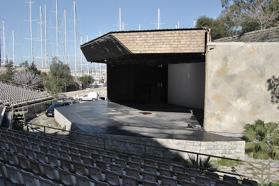 Bodrum Kalesi kuzey hendeği içinde yer alan mevcut açık hava sahnesinin yenileme projesidir. İzleyici kapasitesinin artırıldığı ilk proje Kültür Varlıklarını Koruma Kurulu tarafından onaylanmayınca, mevcut yapının kontur ve yükseklikleri korunarak yapılan ikinci proje uygulanmıştır. Bina 1.derece arkeolojik sit alanı üzerinde yer aldığından, temelleri toprak seviyesinin üzerinde bulunan çelik yapı olarak tasarlanmıştır. Sahne cephesinde kullanılan ahşap lameller ile sur duvarları arasında kontrast yaratılarak yeni yapının geçiciliği vurgulanmıştır.