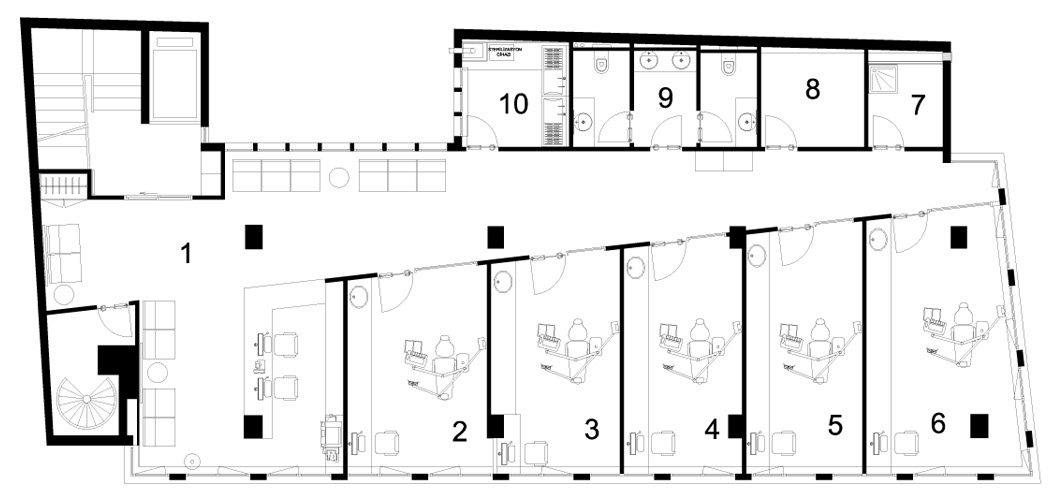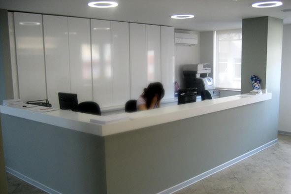 The existing office floor is converted into a dental clinic with 6 units. Concept, construction projects and technical documents are prepared. A translucent main partition is wall is designed in an angle to create more space for the waiting area & to provide more light for the corridors.