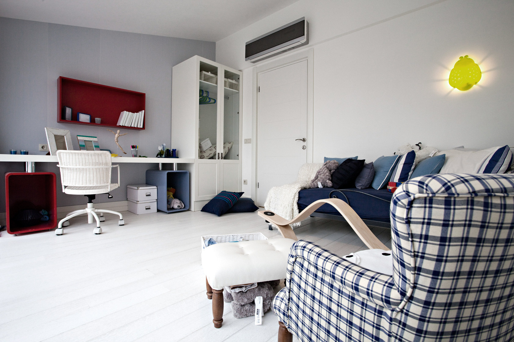 Interior design for a duplex show flat situated in a marine concept residential complex. Marine concept is emphasized by custom details, natural & recycled materials. Some partition walls are demolished in order to provide spatial continuity. The existing concrete stair is replaced with a wooden one with steel construction. Dressing room & bathroom of master bedroom is cancelled and redesigned as cabinets for a larger bedroom area.